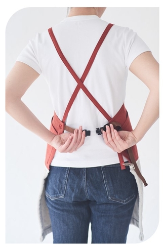 エプロン部分の生地には撥水加工を施したリネン、コットン混合素材を使用し、ナチュラルでありながら 上質な風合いに仕立てています。肩ひもは、首や肩に負担をかけにくいクロスデザインで、3つのボタンで 長さ調整が可能。また、腰ひもにはバックルを採用し、着脱のしやすさにもこだわりました。機能性だけではなく、着用した際の快適さや美しいシルエットまでも追及した、和田さんのこだわりや思いのつまったエプロンです。