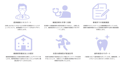 「メンタルヘルス相談窓口」の他、最適な「産業医」を選任・紹介へ健康診断、ストレスチェック、メンタルヘルス研修等、50人以上の企業様はもちろん、49人以下の中小企業様向けにも助成金を活用しての「健康経営」の支援を総合的にサポートしています。