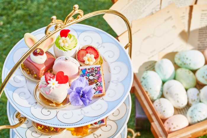 春のアフタヌーンティーは、白うさぎならぬ“イースターバニー”からの招待を受けたアリスが訪れた「不思議の国の花祭り」がテーマ。はじめにアシェットデセール「The Flower Clock~不思議の国への招待状~」を受け取って、色鮮やかな春の花々が咲き誇る不思議の国へと旅立ちます。うさぎに見立てたグリオットケーキ、春のガーデンをイメージしたシュークリーム、ステンドグラスのように色鮮やかなアイシングクッキーなどのスイーツや軽食、スコーンを、マリアージュフレール社の香り高い紅茶とともにご堪能ください。