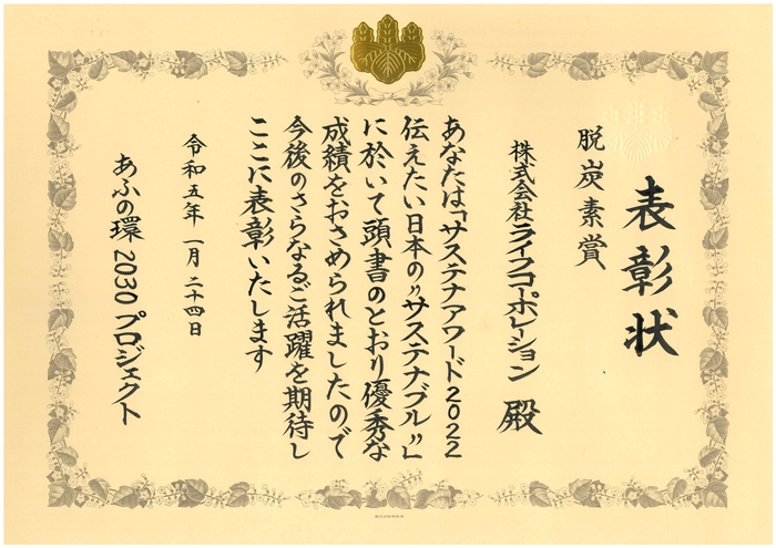 “おいしい” “ワクワク” “ハッピー” をお届けするライフコーポレーションは、農林水産省、消費者庁、環境省の連携プロジェクトであり、「あふの環2030プロジェクト~食と農林水産業のサステナビリティを考える~」が主催した「サステナアワード2022伝えたい日本の“サステナブル”」において、『天保山バイオガス発電設備』の紹介動画が『脱炭素賞』を受賞いたしました。