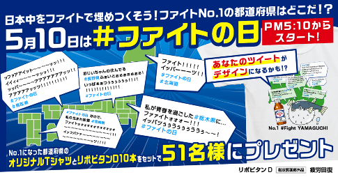 ・5月10日のPM5:10から投稿するキャンペーンツイートに#ファイトの日と#都道府県を入れて引用RTして応募