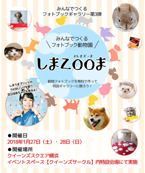 しまうまプリントシステム株式会社(本社:東京都新宿区、代表取締役:高橋洋一郎)は、昨夏~秋と好評を得たフォトブック展示イベント「みんなでつくるフォトブックギャラリー」の第3弾となる「みんなでつくるフォトブック動物園 しまZOOま(#しまズーま)」を、クイーンズスクエア横浜にて2018年1月27日(土)・28日(日)の両日、開催します。