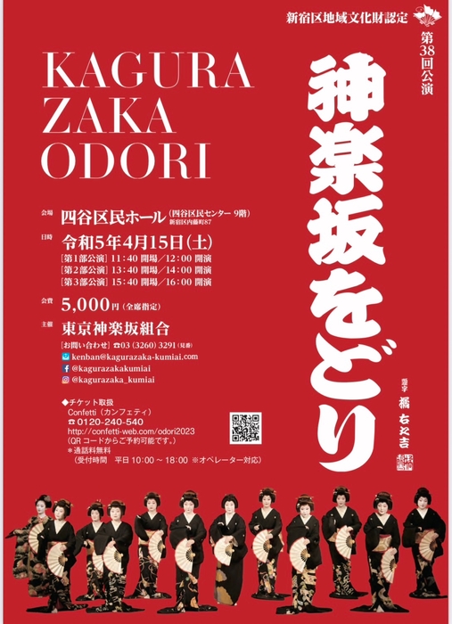 東京神楽坂組合主催、『第38回 神楽坂をどり』が2023年4月15日 (土)に四谷区民ホール(東京都新宿区内藤町87)にて開催されます。チケットはカンフェティ(運営:ロングランプランニング株式会社、東京都新宿区、代表取締役:榑松 大剛)にて発売中です。