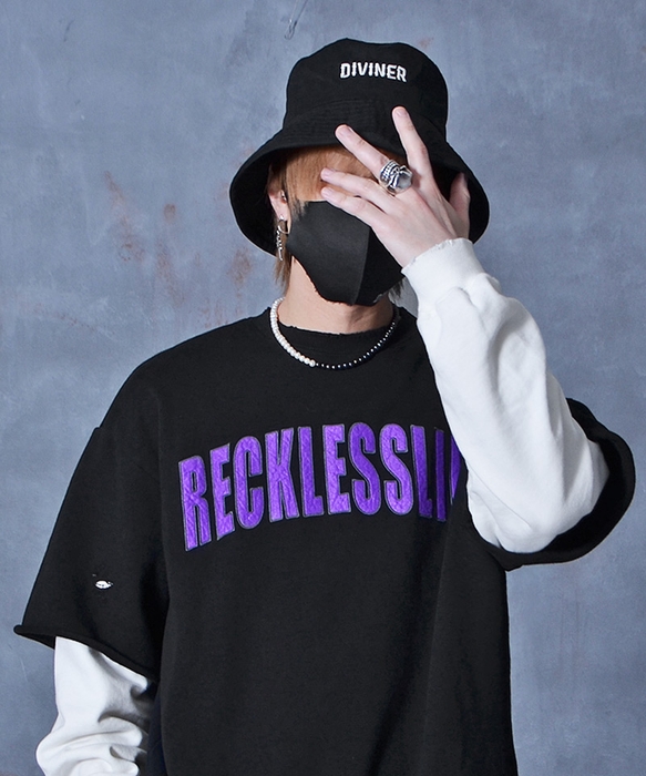 フロント胸元には、カレッジロゴ風の刺繍でコンセプトである「RECKLESS LIFE」をデザインしました。