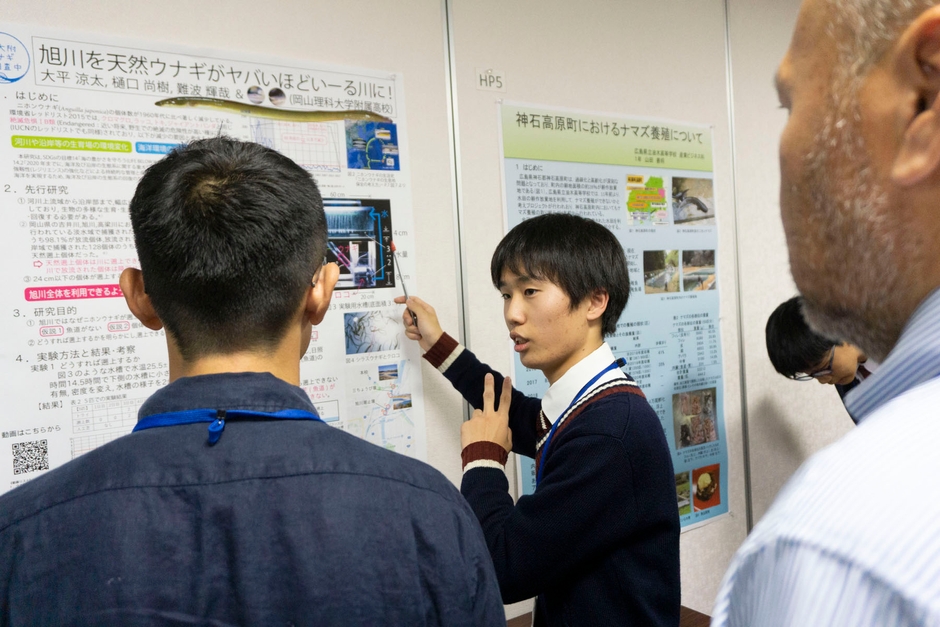 ウナギ研究チームは部員3人で、「ニホンウナギを持続可能な資源にするための研究」をテーマに活動。井関など河川構造物が遡上を妨げていることを確認しました。発表では、こうした研究成果や魚道整備の大切さを、ポスターと口頭説明で呼び掛けました。広島、香川、徳島からの高校生も集まり、熱のこもった発表が行われました。