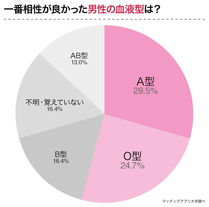 最後に「今までに付き合った男性の中で、性格や価値観が合って一番相性が良いと思った方の血液型を教えてください」と聞いたところ、1位は「A型(29.5%)」、2位は「O型(24.7%)」でした。3位は「B型(16.4%)」、5位は「AB型(13%)」でした。