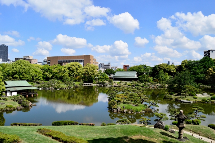 都指定名勝。江戸時代、下総国関宿藩主・久世大和守(くぜやまとのかみ)の下屋敷を含むこの邸地を、明治11(1878)年に岩崎彌太郎が買い取り、社員の慰安や貴賓を招待する場所として、明治13(1880)年に「深川親睦園」として開園しました。彌太郎亡き後、弟の彌之助、息子の久彌により造園工事が進められ、隅田川の水を引いた大泉水を造り、周囲には全国から取り寄せた名石を配して、明治の庭園を代表する「回遊式林泉庭園」が完成しました。