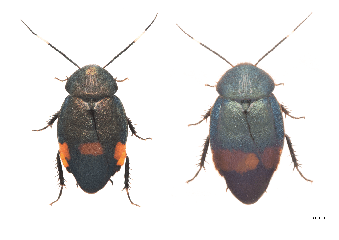 アカボシルリゴキブリ オス(左):ウスオビルリゴキブリ オス(右)