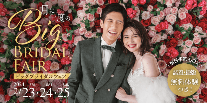 調査の結果「ウェディングフォトでもっと力を入れた方が良かった」と考えている方が多かった、ヘアメイク・フォトグラファー・衣装。そういった気になる点を撮影前に体感いただける、『月に一度のビッグブライダルフェア』を全国各地のスタジオで開催します。カップルフォト撮影や衣装試着などが無料で体験できるほか、ヘアメイクについても気軽にご相談が可能です。