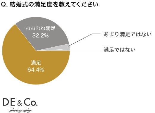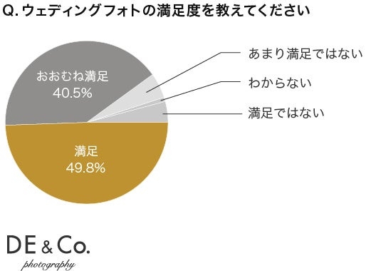 結婚式・ウェディングフォトともに、ほぼ全ての方が満足〜おおむね満足と回答。 結婚式に関しては、回答者の96.6%が「満足」から「おおむね満足」と回答し、非常に高い満足度が示されました。ウェディングフォトに関する満足度も90.3%が「満足」から「おおむね満足」と回答し、結婚式と同程度の高い満足度を感じていることが明らかとなりました。