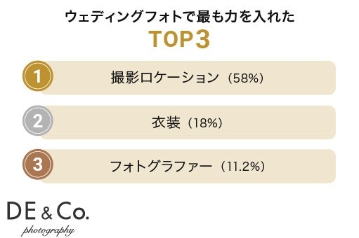 結婚式とウェディングフォトともに、「衣装と場所」に力を入れる傾向が明らかに。 結婚式で最も力を入れたポイントについては「衣装」(26.8%)が最も多い結果となり、次いで「会場」(23.4%)が多い結果となりました。ウェディングフォトにおいては、「撮影ロケーション」(58%)が最も多い結果となり、次いで「衣装」(18%)が多い結果となりました。
