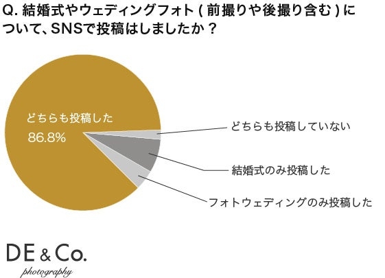 「結婚式でもっと力を入れた方が良かったポイント」については、「フォトグラファー」が20%と最も多い結果となりました。また、ウェディングフォトでは「ヘアメイク」が23.9%で最も多く、「フォトグラファー」が20%で続く結果となりました。加えて「SNSで結婚式やウェディングフォトの様子を投稿したか?」については、86.8%が「どちらもSNSに投稿した」と回答したことから、結婚式やウェディングフォトを綺麗な写真で残したいというだけでなく、SNSで共有したいといったニーズも高いことがわかります。