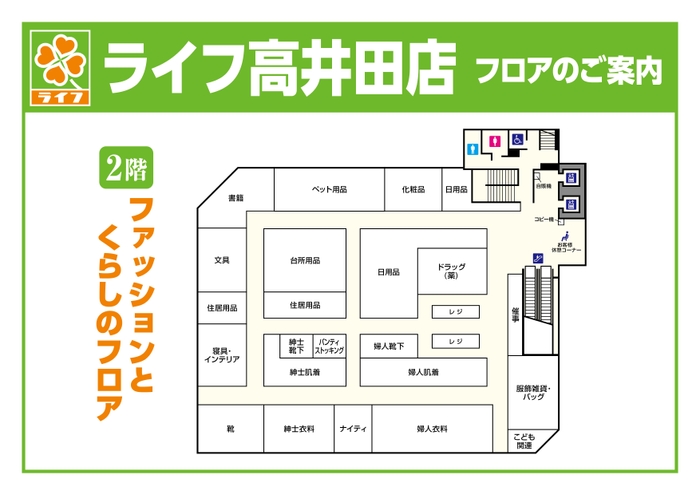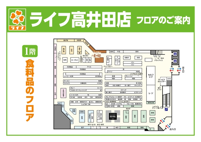 今回の改装では、単身世帯・ニューファミリー世帯が増加している地域特性に合わせて、ライフ自慢のお惣菜・手作りパンや、冷凍食品・ミールキットなど、「時短」につながる簡単・便利な商品を豊富に品ぞろえいたします。また、2階のファッションとくらしのフロアでは、ライフオリジナルの衣料品を導入し、ペットフード・ヘアケアコーナーを拡大するなど、全館で圧倒的な品ぞろえを実現いたします。