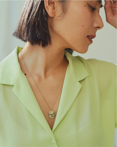 コイン部分にアンティーク風の加工を施したネックレス。素肌だけでなく、ニットやレザーなど、厚みのある服の上にのせても、埋もれない存在感があります。チェーンの長さは2パターンのアレンジが可能。