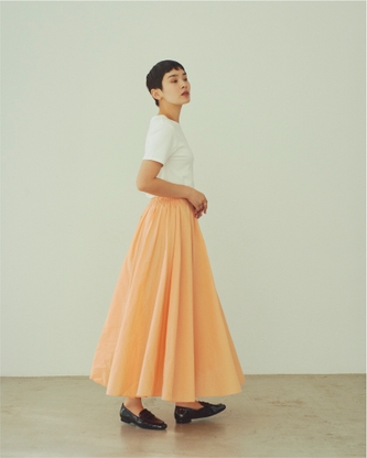 用尺をたっぷりとり、ギャザーをふんだんに入れた、ドラマティックなスカート。サイドファスナー付きで、ウエストの後ろはゴム仕様。同素材・同色のブラウスとセットで着れば、ワンピースのような華やかさが即手に入ります。