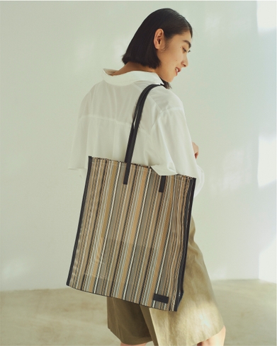 軽やかで涼やかなメッシュ素材のトートバッグ。ハリのある素材が、しっかりと”四角”をキープし、コーディネート全体をキリッと引き締めます。また、縦長、かつきっぱりとした存在感を放つ大きさは、モードなムードを醸します。