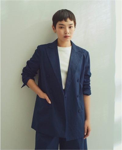 ハーフパンツと同じ麻混素材で仕立てた、マニッシュなダブルブレストジャケット。シャープな肩のラインと長めの着丈が、着こなしをクールに仕上げます。裏地はつけず、さらっと羽織れるようにしました。