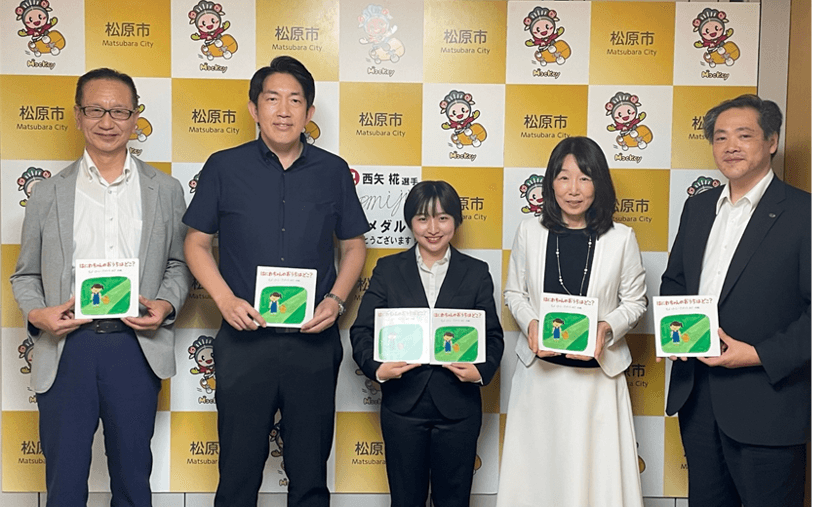 6月8日、坂本教授と松原市出身の教育学部4年生 高橋 真子さんが松原市役所を訪れ、澤井 宏文市長に直接絵本を手渡しました。今回寄贈した絵本は松原市内の公立保育園・幼稚園・こども園・図書館で活用されます。