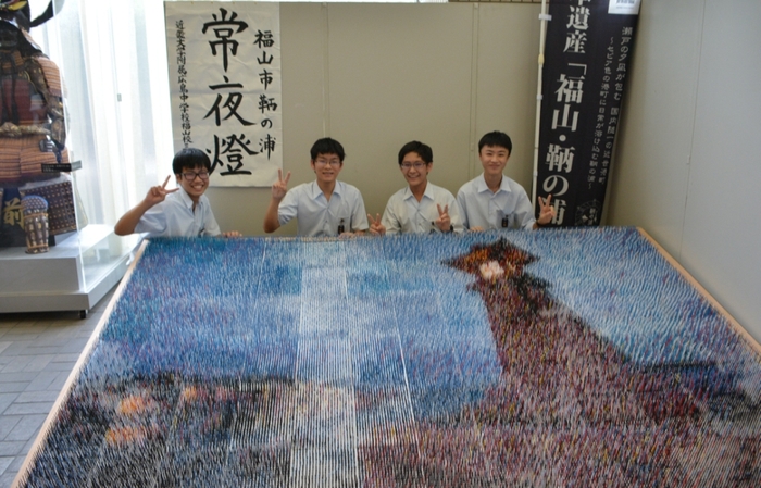 近畿大学附属広島高等学校・中学校福山校の3年生が、広島県福山市の景勝地「鞆の浦(とものうら)」の常夜燈をモチーフとした「つまようじアート」を作成しました。