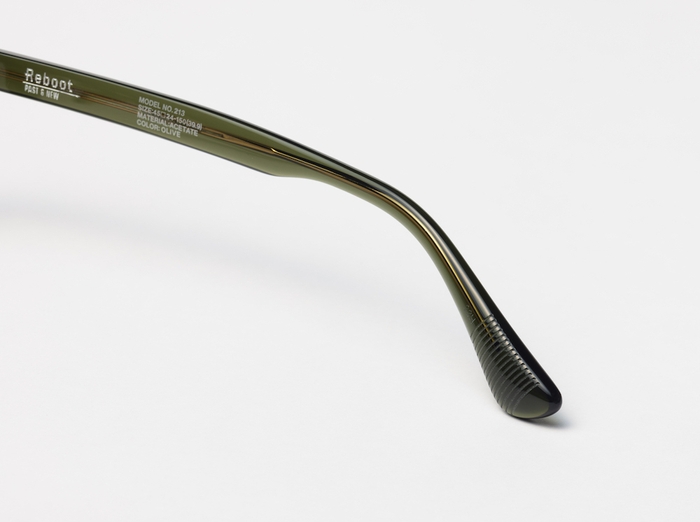 テンプル(ツル)のメタル芯は、Reboot専用となるライン入りの特注品。モダン先端(耳にかかる部分)にはクラシカルなディテールである蛇腹模様の「ギザ」が刻まれる。