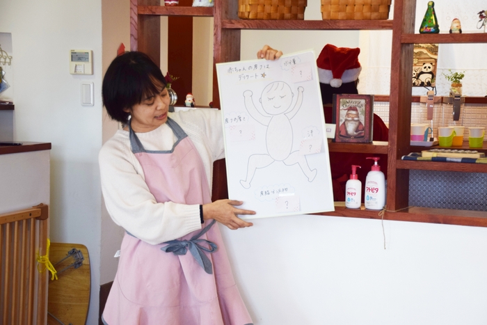 0歳の赤ちゃんとママ13組に集まっていただき、看護師さんから「赤ちゃんのお肌の特徴」や「冬場に気を付けてあげたいこと」などを教えていただきました。看護師さんお手製の「赤ちゃんのイラスト」を使ったクイズ形式でお話しが始まり、楽しい雰囲気の中、参加されたママたちも興味を持ってお話しを聞いてくださりました。