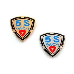 おにぎりのような形をしたオーダーメイドピンズを着用するのは社員の方々。スタッフ全員で一丸となって取り組む運動は、整理・整頓・清掃・清潔・しつけの5つです。仕上げを変えて2タイプの仕様が誕生した完成品は、リーダー用を金メッキで他のピンズと明確に区別。統一されたデザインに「5S」の青い文字を大きく入れることで、優れたメッセージ性も備わった高品質なオリジナルアイテムは、皆さんが気持ちよく働ける環境を構築するための運動を強力にアシストしてくれたようです。
