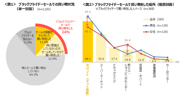 ブラックフライデーセールでの買い物状況について、「買い物をした・計」が24%、「買い物はしていない」が64.3%。「ブラックフライデーを知らない」は11.6%。ブラックフライデーセールで買い物をした人の買い物先としては、「ECサイト(ネット通販)が過半数を占める。<図1・2>