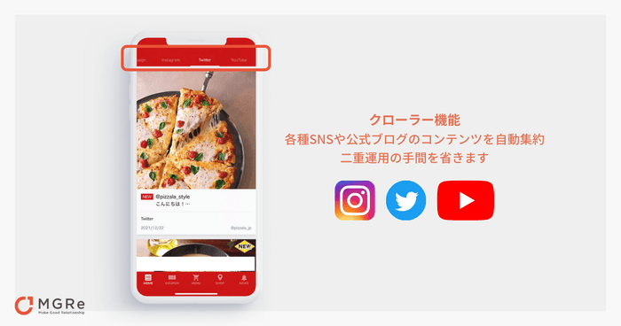 - クローラー機能:blogやTwitter・Youtube・Instagramの記事等を自動で収集する仕組み。アプリ上にコンテンツを自動集約し、アプリの運用作業の負担を大幅に軽減することが可能。