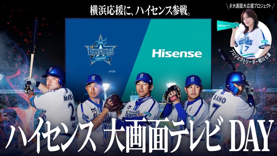 総合家電メーカー、ハイセンスジャパン株式会社(所在地:神奈川県川崎市、代表取締役社長:李 文麗)は、2023年1月23日に神奈川県横浜市を拠点に活動するプロ野球チーム「横浜DeNAベイスターズ」のスポンサーに就任いたしました。3月23日(木)より「大画面大応援プロジェクト」を立ち上げ、プロジェクトリーダーに相川七瀬さんを起用しシーズンを通して様々な取り組みを予定しております。プロジェクトの一環として5月3日(祝・水)の横浜DeNAベイスターズ vs 広島東洋カープの試合ではハイセンス冠試合「Hisenseハイセンス大画面テレビ DAY」を開催する運びとなり、当試合の始球式にはプロジェクトリーダーの相川七瀬さんに登場いただくことが決定しました。その他にも来場者への特別グッズの贈呈や試合中では球場内のビジョンにハイセンスロゴが掲出される等の演出を実施予定です。