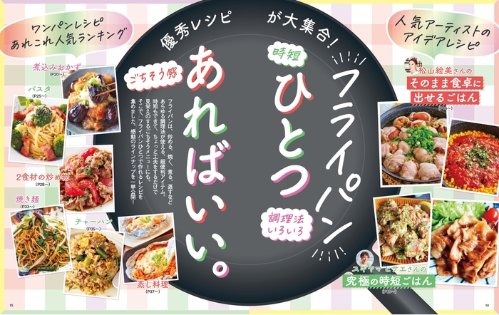 特集ではフライパン1つだけでできるレシピを紹介。フライパンは焼く、炒めるだけでなく、煮る、蒸すなどにも使えるお役立ち調理器具。2食材で作れる簡単おかず、お昼ごはんに作りたい焼き麺レシピ、おもてなしにも作りたい本格煮込みレシピまで、フライパンのポテンシャルを活かすレシピをたっぷり紹介します。