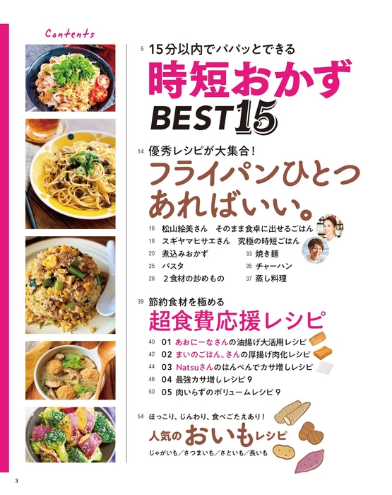 巻頭特集では15分以内で作れる時短おかずを紹介。豆腐の水切りや肉を漬け込む時間など、下準備にかける時間もなし! 作りたいと思ったらすぐにできるレシピだけを集めました。