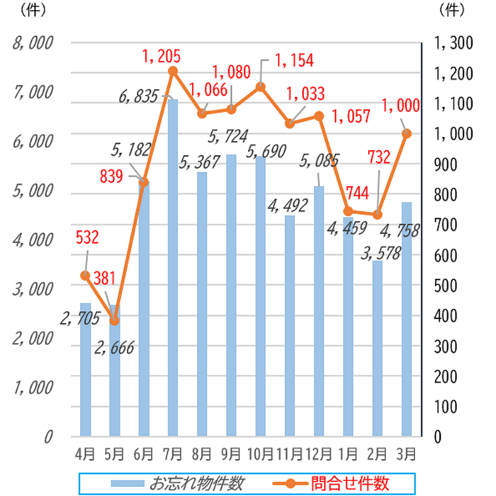 ■月ごとの忘れ物件数とお問い合わせ件数