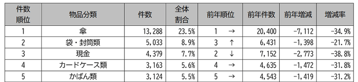 2.忘れ物ランキングでは、傘が最も多く13,288件(前年度比約34.9%減)で、忘れ物全体の約23.5%を占めました。1日あたりでは約36件となります。
