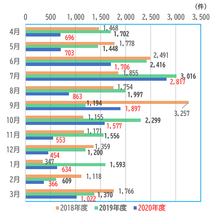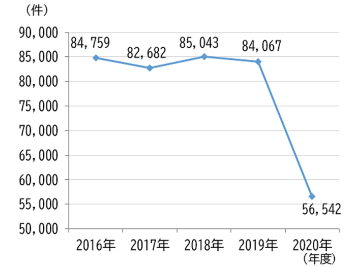 1.2020年度は、56,542件の忘れ物がありました。1日あたりでは約155件となります。前年度と比較すると27,525件(約32.7%)減少しました。二度の緊急事態宣言など新型コロナウイルス感染症の影響で、ご利用のお客さまが大きく減少したことも要因です。