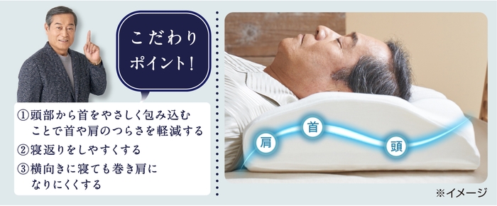 松平健さんの、「首・肩のつらさを軽減」「寝返りのしやすさ」「横向き寝の寝姿勢」の3つのこだわりをすべて反映させ、形状と素材をとことん追求しました。