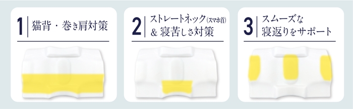 ② 突起が胸椎に当たることでストレートネックを対策できます。また、首をしっかり支えて胸を開きやすくすることで、寝苦しさを軽減します。
