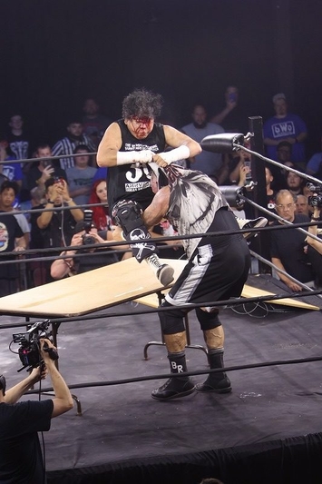 更に大仁田はブリーからギターを振り下ろされ大流血。反撃に出たものの、PCOから有刺鉄線ボードが割れるほど強いタックルを受け、続け様にセントーンを浴びるなど劣勢が続く。