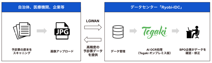 これに対して両備システムズでは、データセンター「Ryobi-IDC」内のサーバーにおいてコージェントラボのAI OCRサービス「Tegaki」オンプレミス版を運用し、LGWANにて遠隔地の自治体から転送された予診票及び接種券のスキャニングデータの高い精度での文字データ化に成功しました。また、アウトソーシングを請け負う企業と連携することで非常に高精度のデータを提供できるようになり、この結果、ワクチン接種業務に携わる自治体職員や医療関係者の事務作業の負担軽減を実現することが可能となりました。