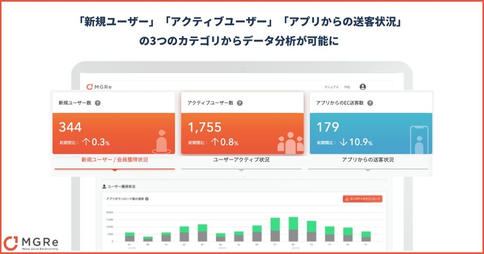メグリ株式会社が提供するアプリの企画・開発から運用までワンストップでマーケティングを支援するアプリマーケティングプラットフォーム「MGRe(メグリ)」は、ダッシュボード機能をアップデートいたしました。MGReで取得したアプリユーザーの行動データを「新規ユーザー」「アクティブユーザー」「アプリからの送客状況」の3つのカテゴリから各種データの閲覧・分析が可能になります。さらに、アプリ運用における定番施策を簡単に確認・実行できる「アクションボード機能」も追加いたしました。