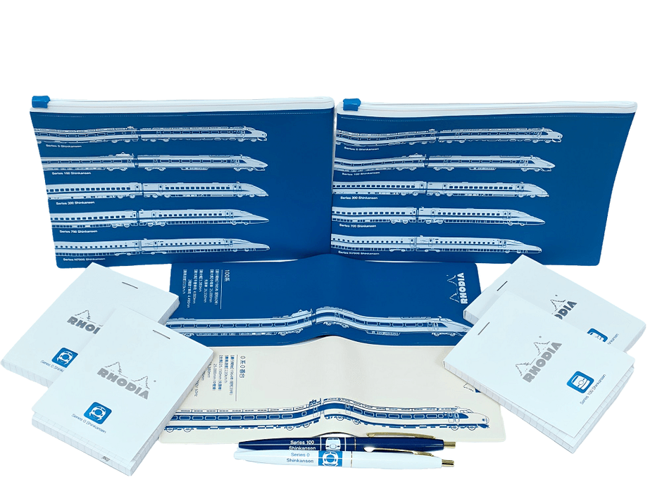 RHODIA・BICとのコラボ商品 0系トラベル筆記セット・100系トラベル筆記セット新発売! 歴代の新幹線が並んだフラットポーチ付き