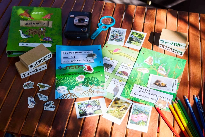 友だちになった生物の特徴や、交流を通じて気づいたことを「友だちノート」にまとめます。貸し出し用のインスタントカメラで、友だちになった生物の写真を撮り、プリントアウト。撮影時は、相手が嫌がることはしないことがルールです。さらに今年は、鳴き声や、好きな食べ物など、生物に関するシールやスタンプを用意。友だちの特徴を思い出しながらノートのデコレーションを楽しめます。家に帰った後も、身近にいる生物に興味を持ち、ノートにまとめることで、友だちの輪を広げることができます。
