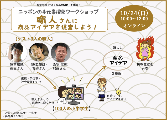日本の伝統や手仕事をテーマにした探究学習「(R)こども商品開発」は、昨年取り組んだ「研究プロジェクトKIDA」から生まれました(※1)。その後も同テーマでたくさんの小中学生が商品開発に挑戦し、本ワークショップの協力事業者「ニッポン手仕事図鑑」や工芸に関わる企業や職人さんに新商品提案をしています。