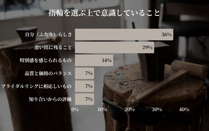 今回の調査では「自分(ふたり)らしさ」が36%と最も重視され、個性や関係性の表現が指輪選びの大きなポイントとなっていることが分かりました。次いで『思い出に残ること』が29%で支持され、