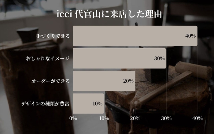 「手づくりできる」(40%)という点が来店の主な決め手となっており、体験を通じて思い出を形にできるサービスが引き続き高い関心を集めています。また、「おしゃれなイメージ」(30%)や「オーダーができる」(20%)といった要素も重視されており、世界にひとつだけの特別なリングを求めるニーズの高まりが感じられます。