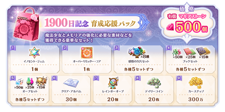 ※「1900日記念 育成応援パック」のご購入はおひとり様1回までです。