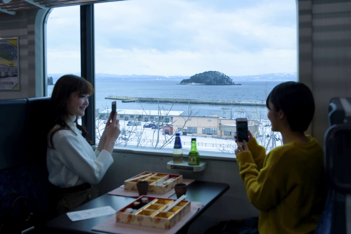 列車は、速度や停車駅を自由に設定できる特別ダイヤで運行します。そのため、通常ダイヤではすぐに通過してしまう場所でも、景色が良いところではゆっくり走行できます。酒のあで雪見列車を運行する期間は、青森で降雪量が多い時期のため、雪原風景や荒波が打ちつける陸奥湾など、雪国ならではの景色を楽しめるのが特徴です。