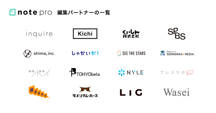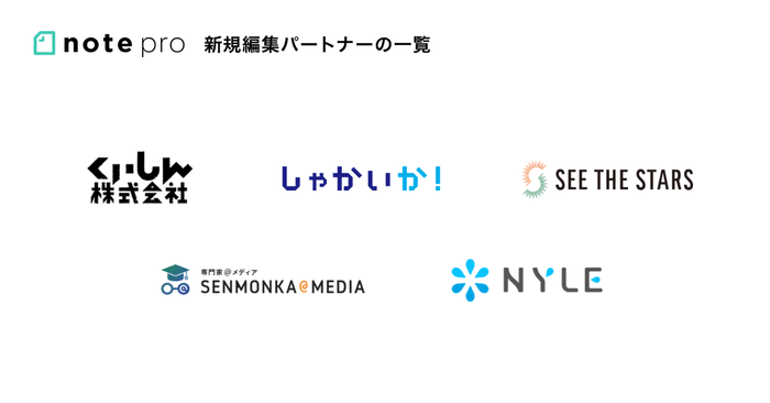 企業のメディア運営やコンテンツ制作を支援するnote pro編集パートナー、くいしん、しゃかいか!、シーザスターズ、専門家@メディア、ナイルが新たに参加。