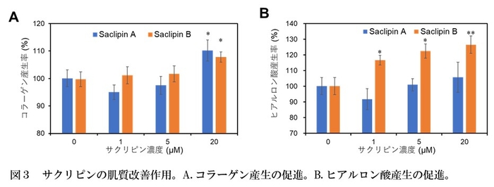 コラーゲン(注8)は皮膚の真皮層に存在する繊維状の蛋白質で、エラスチンと共に皮膚組織の構造維持に関与しています。また、ヒアルロン酸(注9)は糖質の一種で保水力をもつため、肌の保湿や弾力に影響します。本研究により、サクリピンがヒト皮膚線維芽細胞のコラーゲンとヒアルロン酸の産生を促進させる作用を示すことが明らかになりました(図3)。コラーゲンの産生に対してはサクリピンA, Bともに促進効果を有し、ヒアルロン酸の産生に対してはサクリピンBが強い促進作用を示しました。これらの結果から、肌質改善作用をもつスキンケア化粧品への配合剤としてサクリピンBを応用できる可能性があります。