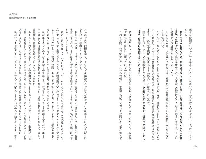 本書では、学習障害のために基本的なことすら理解できなかった著者自身のエピソードをはじめ、ホームレスのシングルファザーから世界的企業を創業し大富豪となったジョン・ポール・デジョリアほか多くの億万長者たちの成功のカギを紹介。そして、それらを「10の幸福の習慣」「簡単に実行できる16の成功習慣」といった再現性のあるノウハウに落とし込んでいきます。