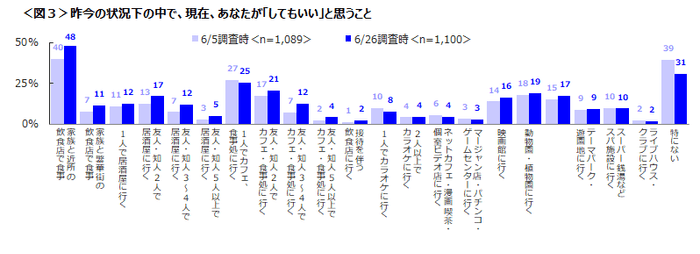 「家族と近所の飲食店で食事」も3週間前より増加し、約半数が「してもいい」と回答。「友人・知人との食事」は「してもいい」と考える人も全体的に上昇していた。<図3>